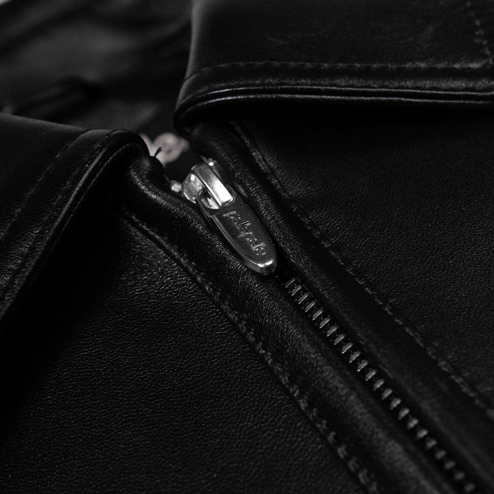 Leather jackets are usually made from cowhide, sheepskin, goatskin, or lambskin. Faux leather jackets use PU or vegan leather.