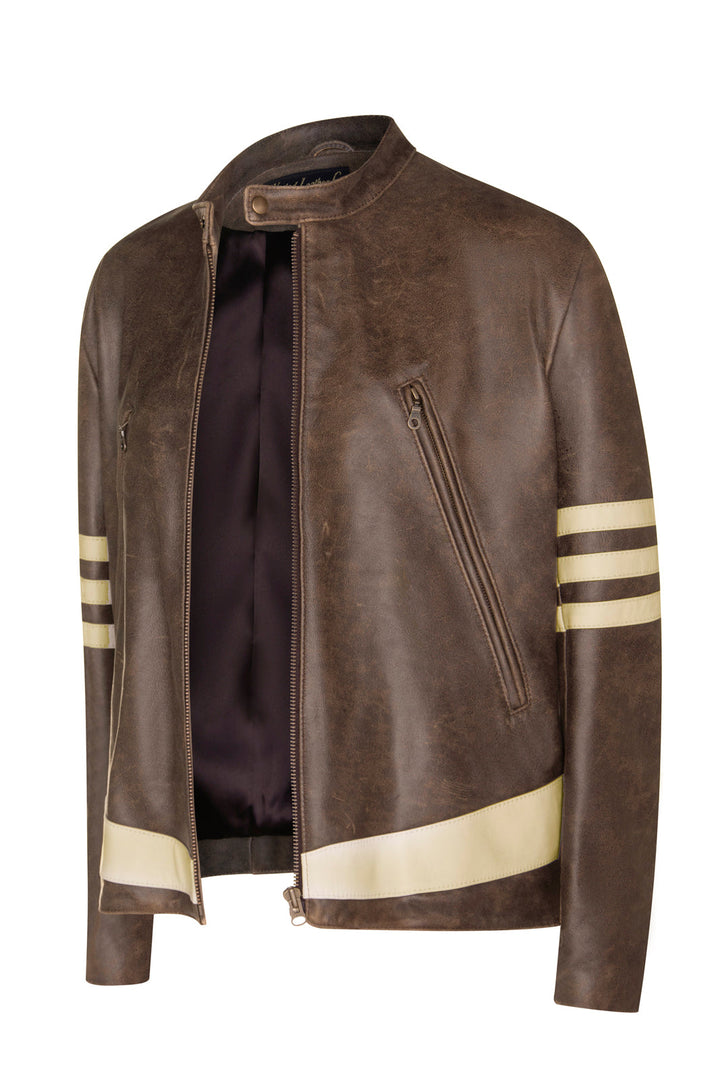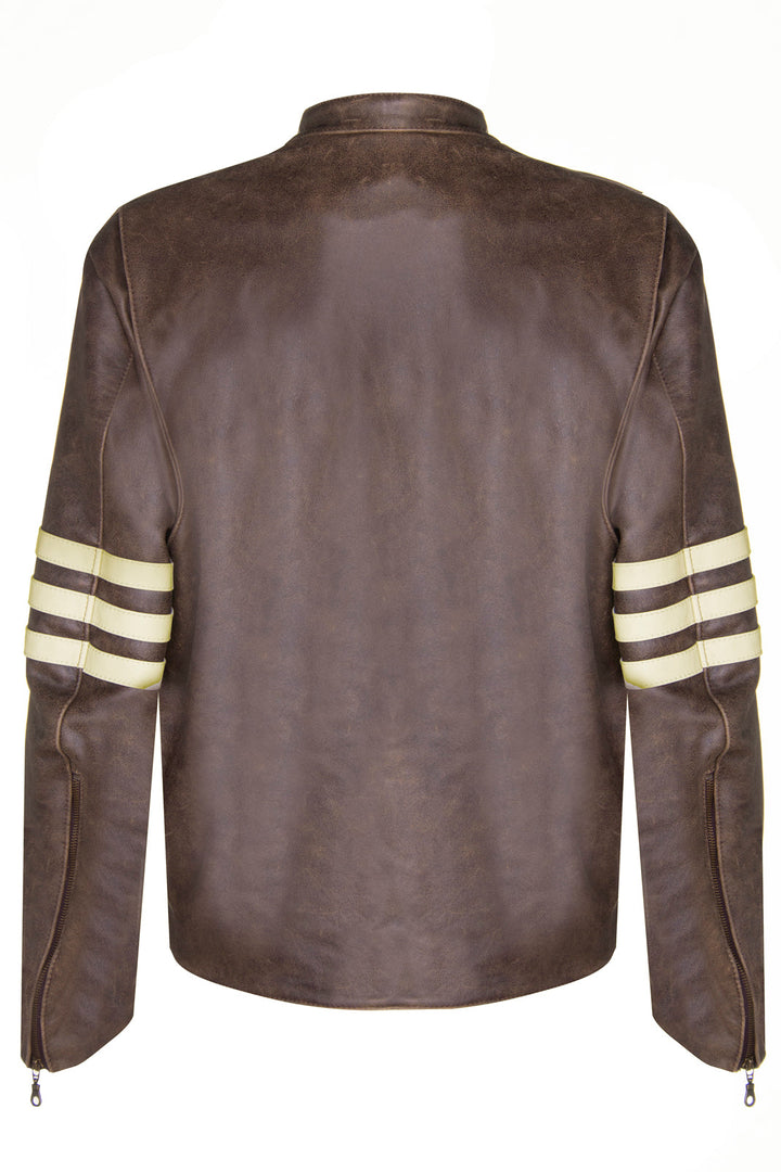 X-Men 1 Wolverine Style Leather Jacket with Cream Stripes As Worn by Hugh Jackman