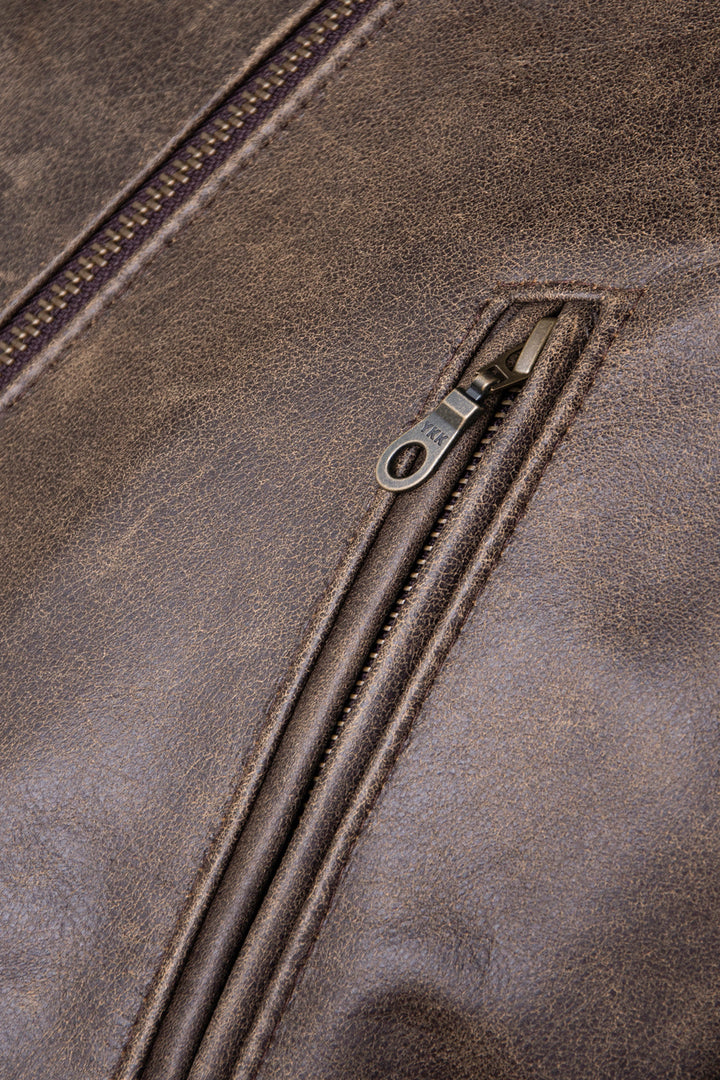 The jacket is a biker style in a medium, weight Pre-Distressed Hide, perfect for everyday wear and for the bikers of the world.